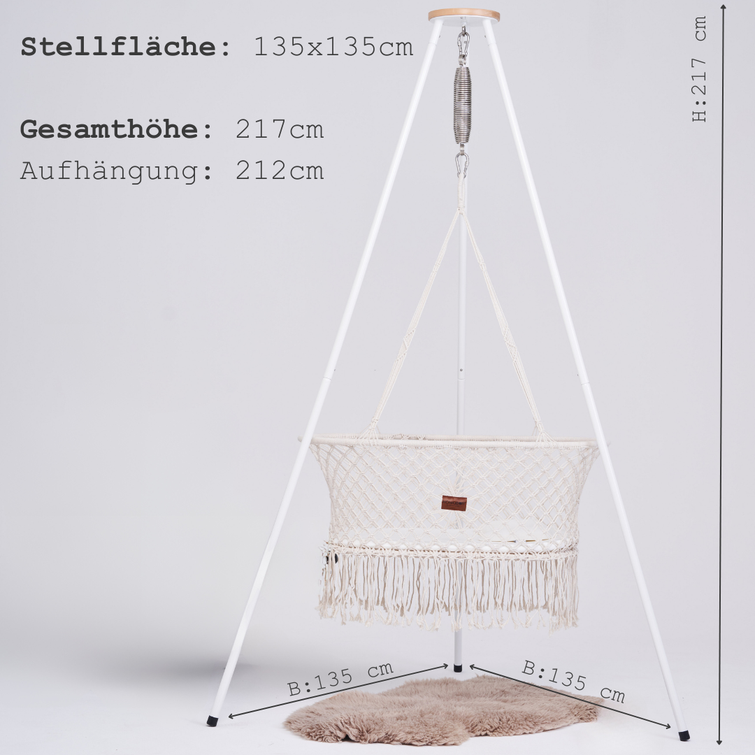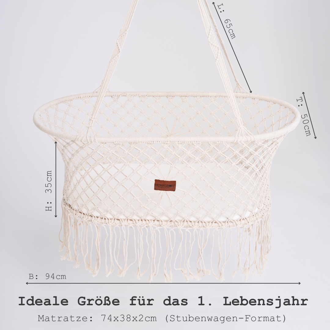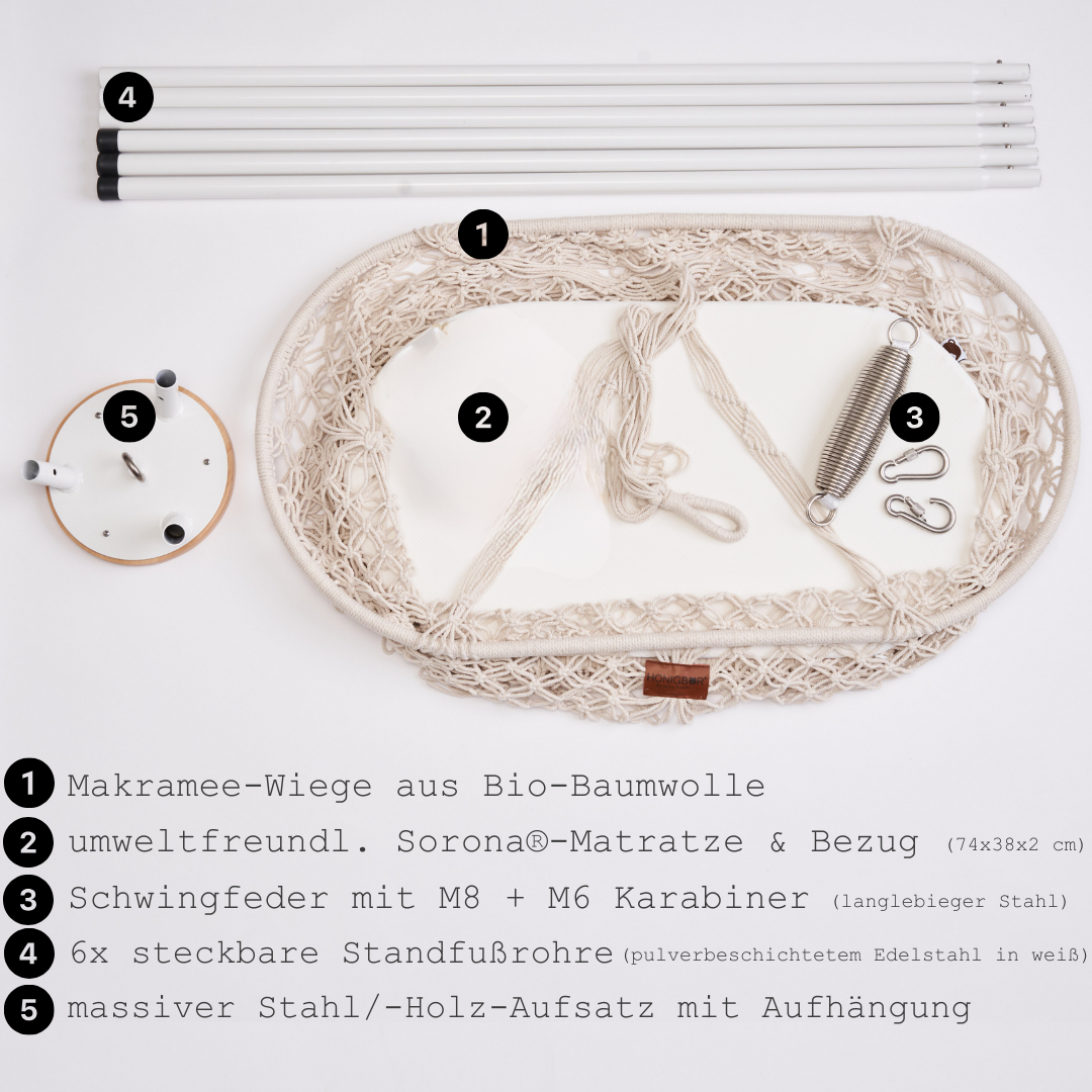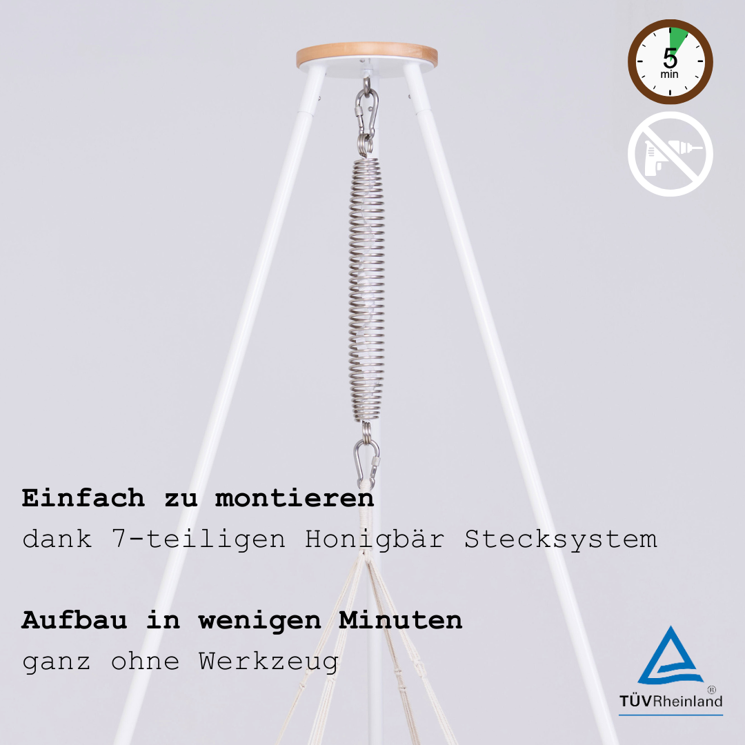 UMWELTFREUNDLICH & NACHHALTIG: Bei der Produktion der Wiege und ihrer Bestandteile haben wir auf höchste Qualität geachtet. Bei der Matratze setzen wir beispielsweise auf die natürliche und patentierte DuPont Sorona®-Faser, die frei von Chemikalien und nach Oeko-Tex 100 zertifiziert ist. Bei der Produktion werden 40% weniger Energie und eine um 63% reduzierte Menge Treibhausgase ausgestoßen (verglichen mit der Herstellung von Nylon 6 bzw. 6,6.). Aus diesem Grund ist die Sorona-Faser mit dem USDA certified bio based product Label zertifiziert und besonders umweltfreundlich.SICHER & GEPRÜFT: Das Gestell mit Buchenholz und drei stabilen Beinen bietet deinem Baby einen extrem sicheren Schutz! Es ist matt weiß mit verhärteter Edelstahl-Aufhängung. TÜV getestet: max. Gewicht bis zu 40kg. Unser Gestell kommt mit einer marktüblichen Standfläche von 135x135cm bei einer Gesamthöhe von 2,17m bzw. Aufhängung bei 2,12m. Der Halt wird dank 3x anti-rutsch Gummifüßen noch sicherer; bei einem Gesamtgewicht von 8kg. Eine Einfaches und schnelle Montage durch das praktische Honigbär-Stecksystem. (Details s.u. Montagehinweis). Unsere sanften Schwingfeder aus langlebigen Stahl inkl. extra Sicherungsseil bietet bestmöglichen Schutz. Sie ist ebenfalls TÜV geprüft und schwingt optimal bei 5-15kg. Die theoretische Belastungsgrenze der Schwingfeder beträgt 40kg. Die Schwingfeder wird einfach am M6-Drehkarabiner (welcher für pendelfreies & sanftes Schwingen sorgt) an der Aufhängung des Gestells eingehängt und wird am anderen Ende mit dem M8-Sicherheitskarabiner in die 8cm große Schlaufe der Makramee-Wiege eingehangen und anschließen durch Verschrauben zusätzlich gesichert.