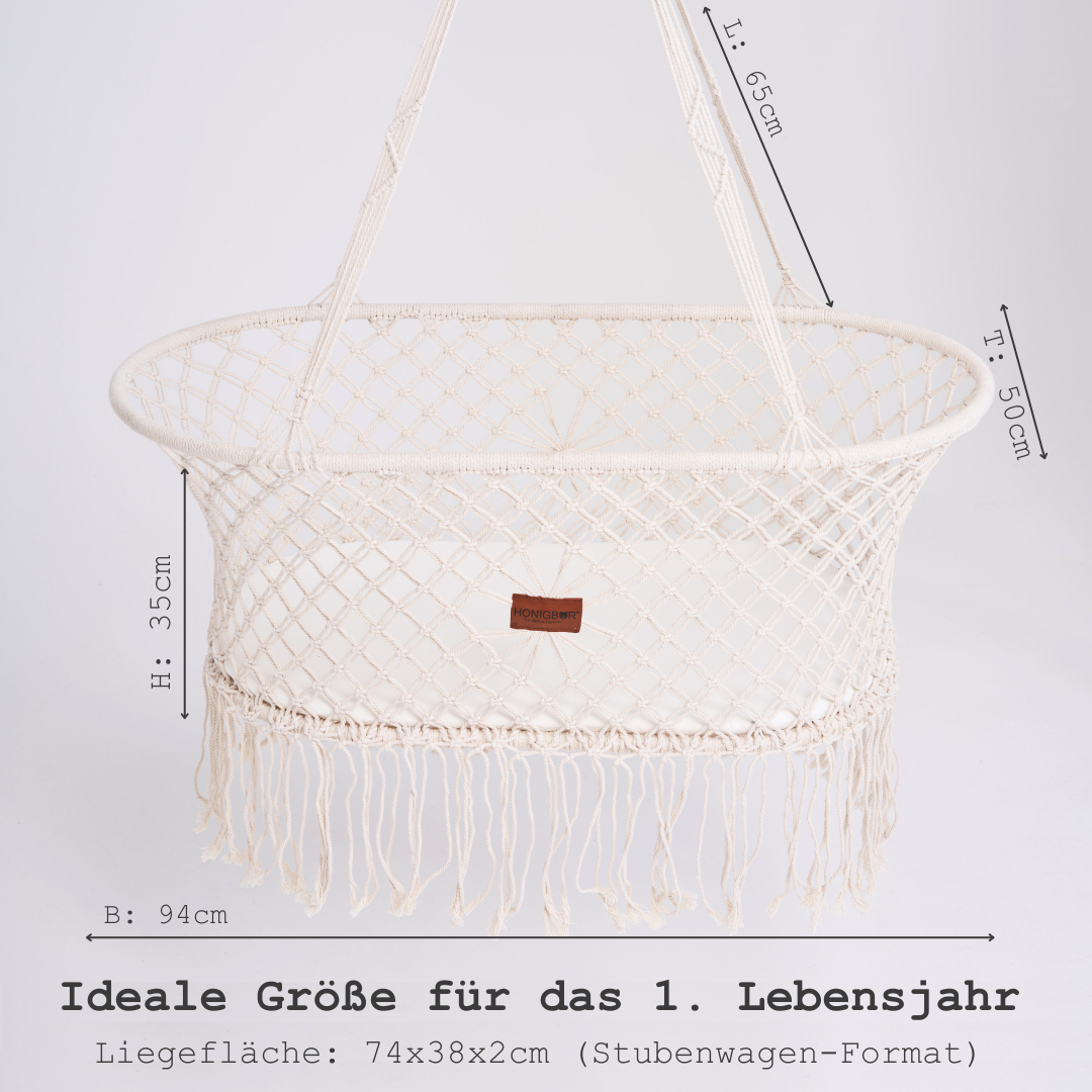 Das Makrame ist super schön. Ich liebe es. Und in der Praxis hat mich die Wiege oft gerettet, da unser Kind darin sofort ruhig war.
