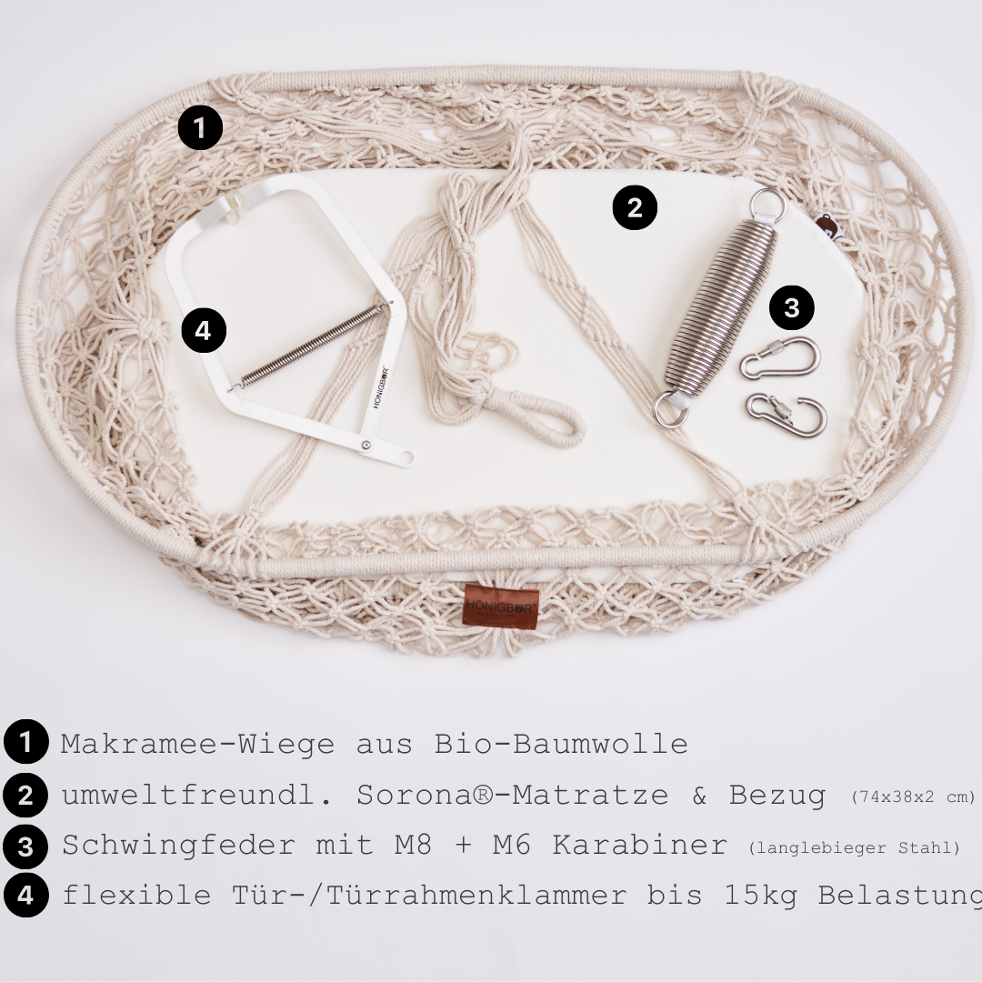 Komfortabel: Komplett-Set bestehend aus Nestchen/Wiege, Matratze, Feder inkl. Sicherungsseil/Karabiner, Aufhängung (Gestell/Decke/Türrahmen) und optional Motor. Unsere Komplett-Sets umfassen, alle notwendigen Teile und sind sofort Einsatzbereit. Honigbär bietet Praktisches Zubehör: Matratzenschoner, zweiter Bezug, Lichtschutz/Moskitonetz, sind derzeit noch nicht bei uns im Sortiment erhältlich, wir empfehlen andere Hersteller wie Moonboon, Swing2Sleep oder alternativen auf Amazon.de.